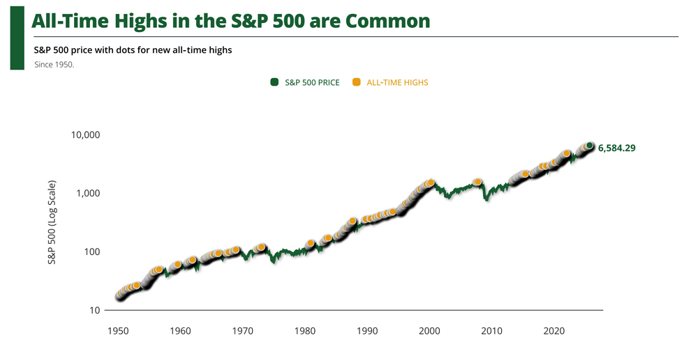 It’s natural to feel cautious. After all, no one wants to buy at the top. But history, data, and financial planning experience suggest a more reassuring perspective: all-time highs are not red flags but milestones on a market’s long-term upward journey.