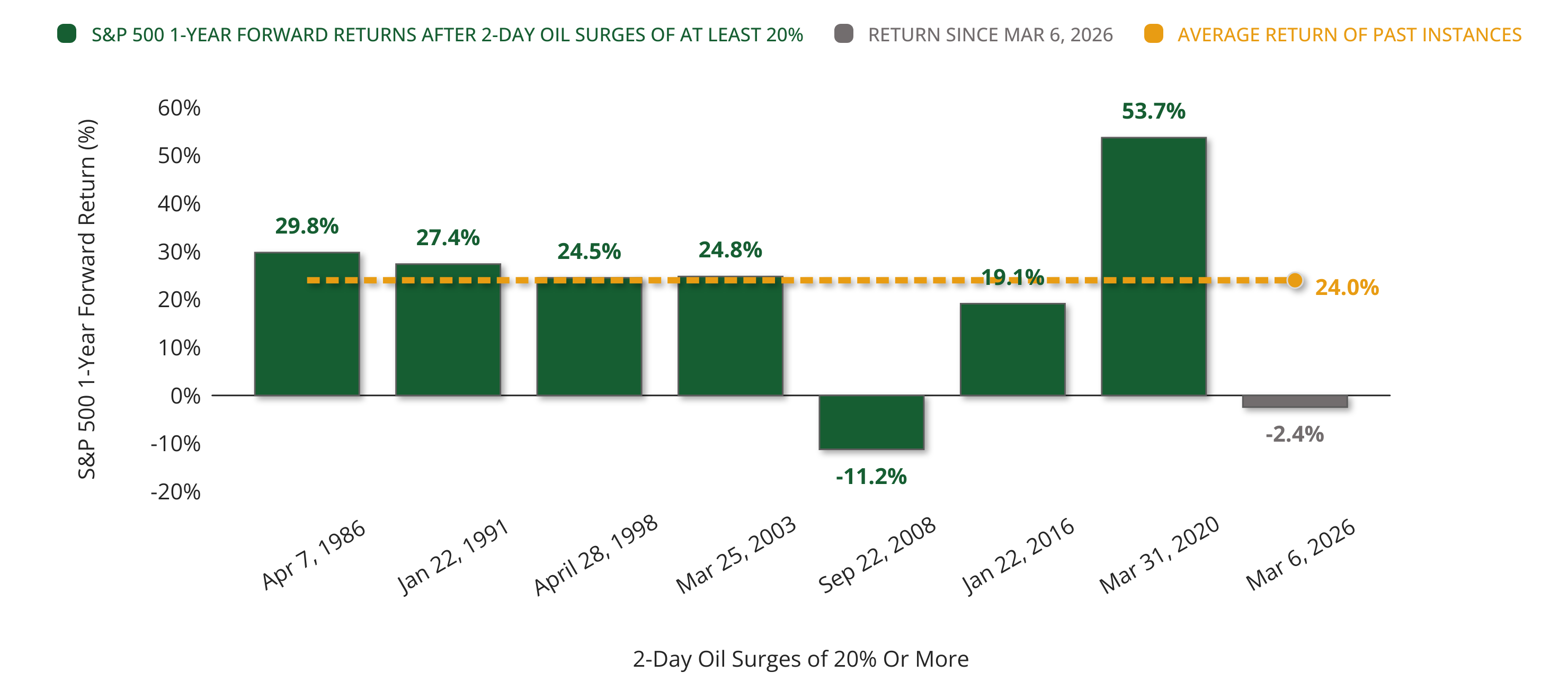 S&P 500 1-Year Forward Return Following 2-Day Oil Surges of 20%+
