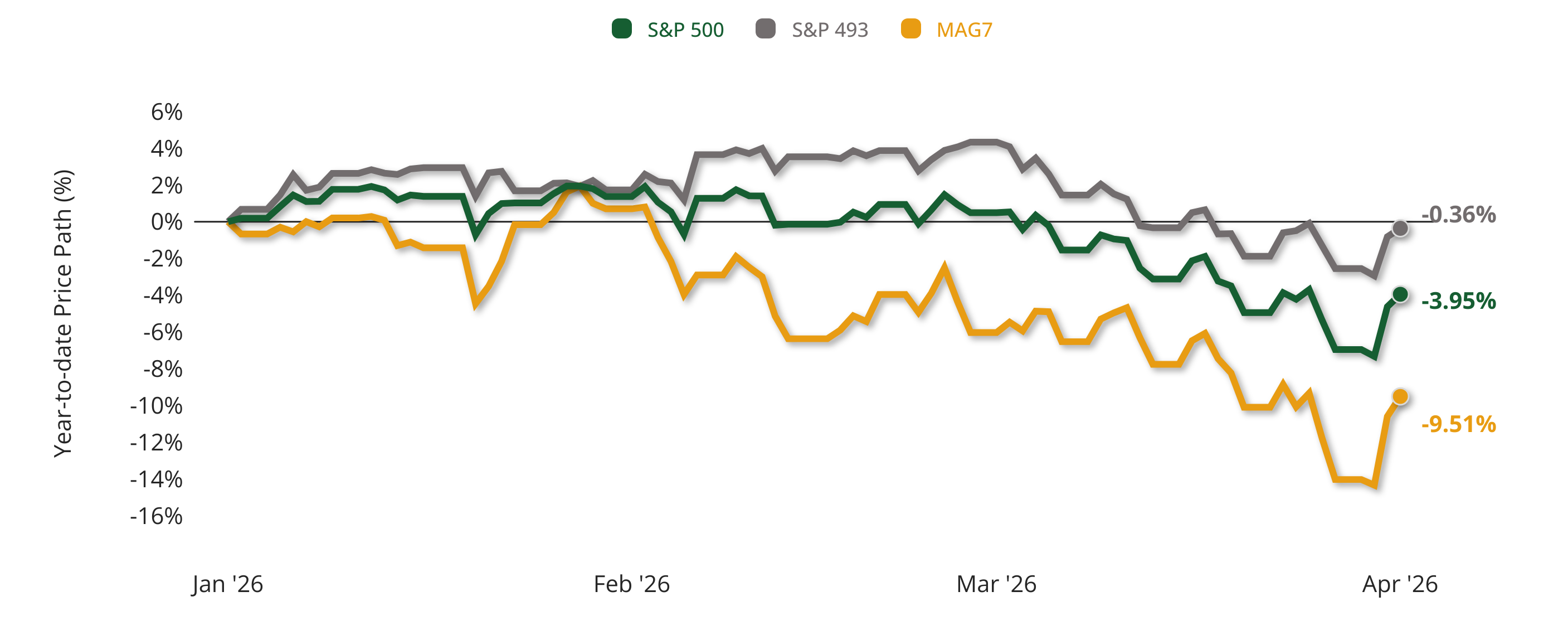 Year-to-date (YTD) Price Path of the S&P 500, S&P 493, and the Mag7