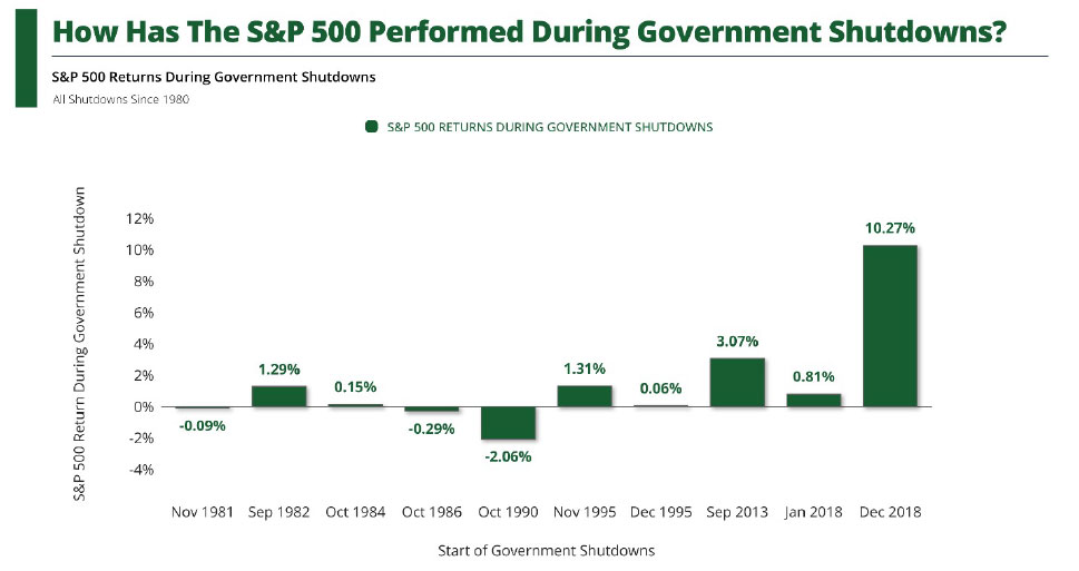 This slide is for informational and illustrative purposes only. The data provided is believed to be accurate, but there is no guarantee of its accuracy, completeness, or timeliness. This is not a recommendation or offer of any financial product. Past performance is not indicative of future results, and investors should consider their own obiectives and risk tolerance. Indices, if presented, do not include fees, are unmanaged, and not available for direct investment. Definitions & Methodology: The S&P 500 tracks the performance of 500 large-cap U.S. companies, serving as a benchmark for the U.S. stock market. The index is market cap weighted. The chart shows the market S&P 500 price returns from the start to the end of government shutdowns since 1980. The government shutdown start and end dates are as follows: Nov 1981 (11/19/1981-11/23/1981), Sep 1982 (9/29/1982-10/2/1982), Oct 1984 (10/2/1984-10/5/1984), Oct 1986(10/15/1986-10/18/1986), Oct 1990 (10/4/1990-10/9/19903, Nov 1995 (11/10/1995-11/19/1995), Dec 1995 (12/14/1995-1/6/1996), Sep 2013 (9/27/2013-10/17/2013), Jan 2018(1/18/2018-1/22/2018), and Dec 2018 (12/20/2018-1/25/2019).